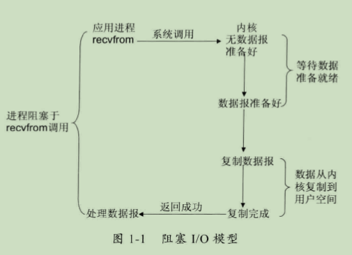 (1)阻塞IO模型:最常用的IO模型就是阻塞IO模型,缺省情形下,所有文件操作都是阻塞的。我们以套接字接口为例来讲解此模型:在进程空间中调用recvfrom,其系统调用直到数据包到达且被复制到应用进程的缓冲区中或者发生错误时才返回,在此期间一直会等待,进程在从调用recvfrom开始到它返回的整段时间内都是被阻塞的,因此被称为阻塞I/O模型,如图1-1所示。
