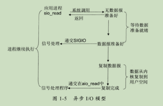 (5)异步 IO:告知内核启动某个操作,并让内核在整个操作完成后(包括将数据从内核复制到用户自己的缓冲区)通知我们。这种模型与信号驱动模型的主要区别是:信号驱动IO由内核通知我们何时可以开始一个I/O 操作;异步IO模型由内核通知我们IO操作何时已经完成,如图1-5所示。