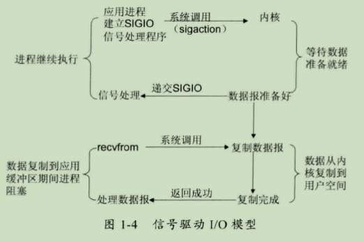 (4)信号驱动I/O模型:首先开启套接口信号驱动I/O功能,并通过系统调用sigaction执行一个信号处理函数(此系统调用立即返回,进程继续工作,它是非阻塞的)。当数据准备就绪时,就为该进程生成一个 SIGIO信号,通过信号回调通知应用程序调用recvfrom来读取数据,并通知主循环函数处理数据,如图1-4所示。