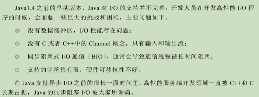 在JDK 1.4推出Java NIO之前,基于Java的所有Socket通信都采用了同步阻塞模式(BIO),这种一请求一应答的通信模型简化了上层的应用开发,但是在性能和可靠性方面却存在着巨大的瓶颈。因此,在很长一段时间里,大型的应用服务器都采用C或者C++语言开发,因为它们可以直接使用操作系统提供的异步I/O或者AIO能力。当并发访问量增大、响应时间延迟增大之后,采用Java BIO开发的服务端软件只有通过硬件的不断扩容来满足高并发和低时延,它极大地增加了企业的成本,并且随着集群规模的不断膨胀,系统的可维护性也面临巨大的挑战,只能通过采购性能更高的硬件服务器来解决问题,这会导致恶性循环。