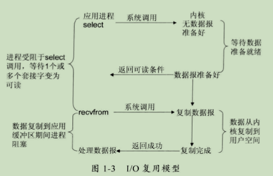 (3) IO复用模型:Linux提供 select/poll,进程通过将一个或多个fd传递给select或poll系统调用,阻塞在select操作上,这样select/poll 可以帮我们侦测多个fd是否处于就绪状态。select/poll是顺序扫描fd是否就绪,而且支持的fd数量有限,因此它的使用受到了一些制约。Linux还提供了一个epoll 系统调用,epoll 使用基于事件驱动方式代替顺序扫描,因此性能更高。当有fd就绪时,立即回调函数rollback,如图1-3所示。