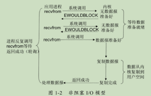 (2)非阻塞I/O模型:recvfrom从应用层到内核的时候,如果该缓冲区没有数据的话,就直接返回一个EWOULDBLOCK错误,一般都对非阻塞I/O模型进行轮询检查这个状态,看内核是不是有数据到来,如图1-2所示。
