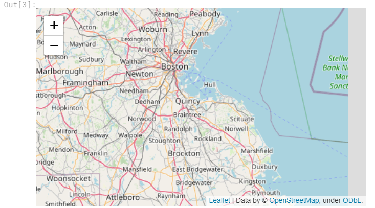 location设置地图的初始中心。我们使用波士顿市的纬度(42.32°N)和经度(-71.0589°E)。tiles会更改地图的样式;在这种情况下,我们选择OpenStreetMap样式。如果您好奇,可以在这里找到其他选项。zoom_start设置地图的初始缩放级别,较高的值会放大到更接近地图的位置。