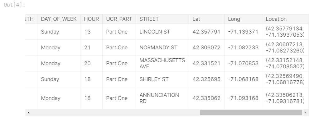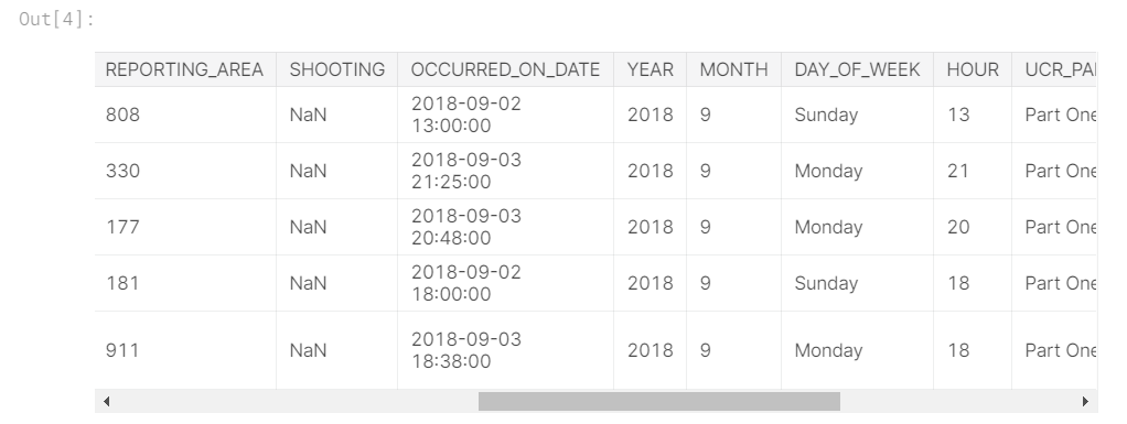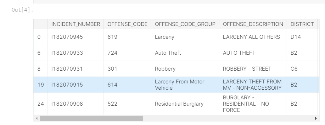 我们不会专注于数据加载步骤。相反,您可以想象您正处于pandas DataFramecrimes 中的一个点。数据的前五行如下所示。
