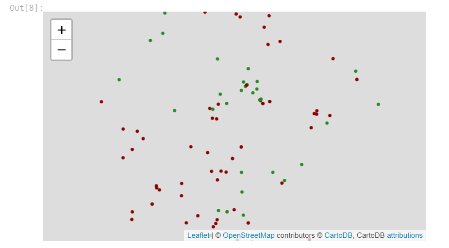 我们使用folium.Circle()创建一个气泡图来迭代添加圆。 在下面的代码单元中,在9-12点发生的抢劫用绿色绘制,而在13-17点发生的抢劫用红色绘制。
