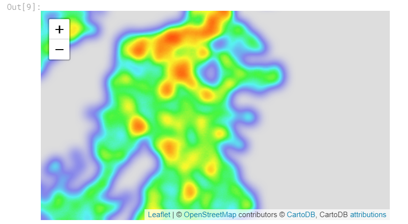 data是一个DataFrame,其中包含我们要绘制的位置。radius(半径)控制热图的平滑度。 较高的值可使热图看起来更平滑(即,间隙较小)。