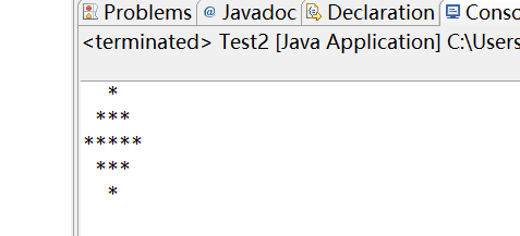 package homework; public class Test2 { /** * @param args */ public static void main(String[] args) { // TODO Auto-generated method stub System.out.println(" *"); System.out.println(" ***"); System.out.println("*****"); System.out.println(" ***"); System.out.println(" *"); } }
