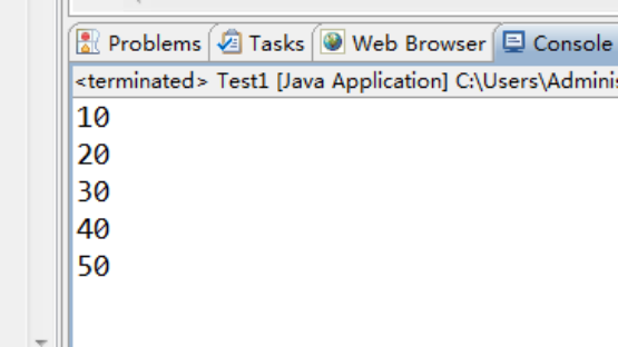 package lh; public class Test1 { /** * @param args */ public static void main(String[] args) { // TODO Auto-generated method stub int []a={10,20,30,40,50}; for (int i = 0; i < 5; i++) { System.out.println(a[i]); } } }