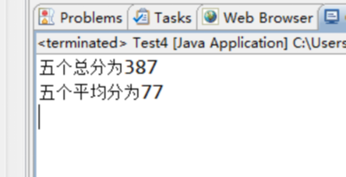 package lh; public class Test4 { /** * @param args */ public static void main(String[] args) { // TODO Auto-generated method stub int []a={67,87,56,78,99}; int p = 0; int sum=0; for (int i = 0; i < 5; i++) { sum=a[0]+a[1]+a[2]+a[3]+a[4]; p=(a[0]+a[1]+a[2]+a[3]+a[4])/5; } System.out.println("五个总分为"+sum+"\n"+"五个平均分为"+p); } }