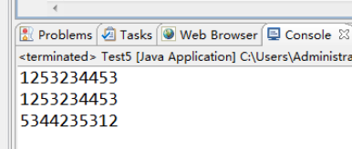 package lh; public class Test5 { /** * @param args */ public static void main(String[] args) { // TODO Auto-generated method stub int []a={12,53,23,44,53}; for (int i = 0; i <5; i++) { System.out.print(a[i]); } System.out.println(); for (int i : a) { System.out.print(i); } System.out.println(); for (int i =4; i >=0; i--) { System.out.print(a[i]); } } }