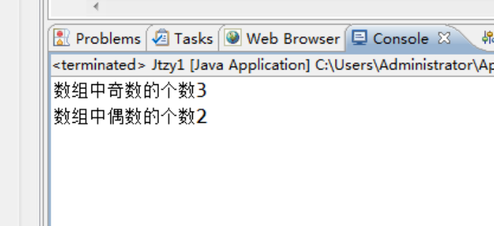 package lh; public class Jtzy1 { /** * @param args */ public static void main(String[] args) { // TODO Auto-generated method stub int []a={21,56,45,28,55}; int ji=0; int ou=0; for (int i = 0; i < 5; i++) { if (a[i]%2==0) { ou+=1; } if (a[i]%2!=0) { ji+=1; } } System.out.println("数组中奇数的个数"+ji+"\n"+"数组中偶数的个数"+ou); } }
