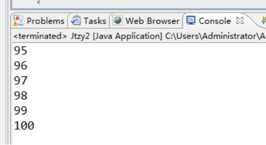 package lh; public class Jtzy2 { /** * @param args */ public static void main(String[] args) { // TODO Auto-generated method stub int []a=new int[100]; for (int i = 0; i <100; i++) { a[i]=i+1; System.out.println(a[i]); } } }