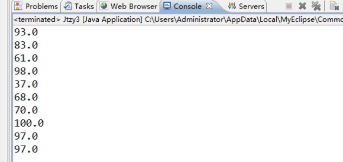 package lh; public class Jtzy3 { /** * @param args */ public static void main(String[] args) { // TODO Auto-generated method stub double []a={88,78,56,98,32,63,65,95,92,97}; for (int i = 0; i <10; i++) { a[i]=a[i]+5; if (a[i]>100) { a[i]=a[i]-5; } System.out.println(a[i]); } } }