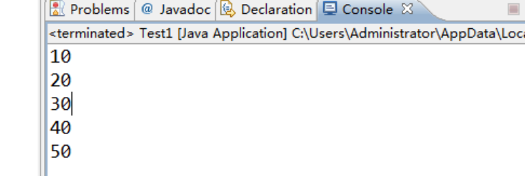package hy; public class Test1 { /** * @param args */ public static void main(String[] args) { // TODO Auto-generated method stub int []a={10,20,30,40,50}; for (int i = 0; i <5; i++) { System.out.println(a[i]); } } }
