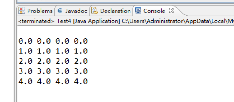 package hy; public class Test4 { /** * @param args */ public static void main(String[] args) { // TODO Auto-generated method stub double [][]a={{0,0,0,0},{1,1,1,1},{2,2,2,2},{3,3,3,3},{4,4,4,4}}; for (int i = 0; i < a.length; i++) { System.out.println(); for (int j = 0; j < a[i].length; j++) { System.out.print(a[i][j]+" "); } } } }