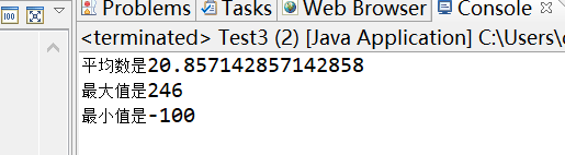 package jtzy426; public class Test3 { /** * @param args */ public static void main(String[] args) { // TODO Auto-generated method stub int a[] = { -10, 2, 3, 246, -100, 0, 5 }; double p = 0; double sum = 0; int max = a[0]; int min = a[0]; for (int i = 0; i < a.length; i++) { sum += a[i]; } p = sum / a.length; for (int i = 1; i < a.length; i++) { if (a[i] > max) { max = a[i]; } if (a[i] < min) { min = a[i]; } } System.out.println("平均数是" + p + "\n" + "最大值是" + max + "\n" + "最小值是" + min); } }