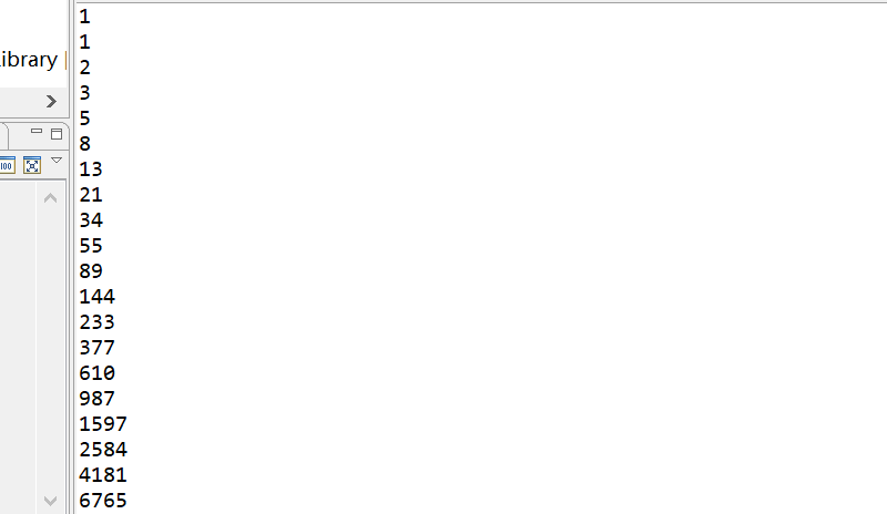package jtzy426; public class Test4 { /** * @param args */ public static void main(String[] args) { // TODO Auto-generated method stub int []a=new int[20]; a[0]=1; a[1]=1; for (int i = 2; i < a.length; i++) { a[i]=a[i-1]+a[i-2]; } for (int i = 0; i < a.length; i++) { System.out.println(a[i]); } } }