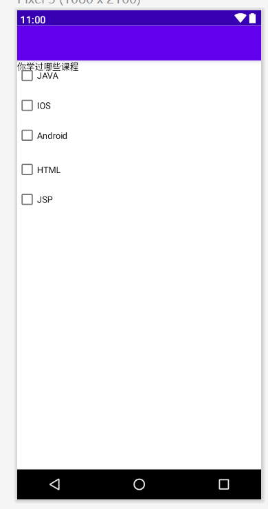 <?xml version="1.0" encoding="utf-8"?> <androidx.constraintlayout.widget.ConstraintLayout xmlns:android="http://schemas.android.com/apk/res/android" xmlns:app="http://schemas.android.com/apk/res-auto" xmlns:tools="http://schemas.android.com/tools" android:layout_width="match_parent" android:layout_height="match_parent" tools:context=".MainActivity"> <TextView android:layout_width="wrap_content" android:layout_height="wrap_content" android:text="你学过哪些课程" android:textColor="#000000" tools:ignore="MissingConstraints" /> <CheckBox android:layout_width="match_parent" android:layout_height="wrap_content" android:text="JAVA" tools:ignore="MissingConstraints" /> <CheckBox android:layout_width="match_parent" android:layout_height="wrap_content" android:text="IOS" tools:ignore="MissingConstraints" tools:layout_editor_absoluteX="0dp" tools:layout_editor_absoluteY="48dp" /> <CheckBox android:layout_width="match_parent" android:layout_height="wrap_content" android:text="Android" tools:ignore="MissingConstraints" tools:layout_editor_absoluteX="0dp" tools:layout_editor_absoluteY="96dp" /> <CheckBox android:layout_width="match_parent" android:layout_height="wrap_content" android:text="HTML" tools:ignore="MissingConstraints" tools:layout_editor_absoluteX="0dp" tools:layout_editor_absoluteY="151dp" /> <CheckBox android:layout_width="match_parent" android:layout_height="wrap_content" android:text="JSP" tools:ignore="MissingConstraints" tools:layout_editor_absoluteX="0dp" tools:layout_editor_absoluteY="199dp" /> </androidx.constraintlayout.widget.ConstraintLayout>