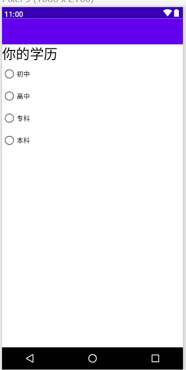<?xml version="1.0" encoding="utf-8"?> <androidx.constraintlayout.widget.ConstraintLayout xmlns:android="http://schemas.android.com/apk/res/android" xmlns:tools="http://schemas.android.com/tools" android:layout_width="match_parent" android:layout_height="match_parent"> <TextView android:layout_width="wrap_content" android:layout_height="wrap_content" android:text="你的学历" android:textSize="30dp" android:textColor="#000000" tools:ignore="MissingConstraints" /> <RadioButton android:layout_width="wrap_content" android:layout_height="wrap_content" android:text="初中" tools:ignore="MissingConstraints" tools:layout_editor_absoluteX="0dp" tools:layout_editor_absoluteY="40dp" /> <RadioButton android:layout_width="wrap_content" android:layout_height="wrap_content" android:text="高中" tools:ignore="MissingConstraints" tools:layout_editor_absoluteX="0dp" tools:layout_editor_absoluteY="88dp" /> <RadioButton android:layout_width="wrap_content" android:layout_height="wrap_content" android:text="专科" tools:ignore="MissingConstraints" tools:layout_editor_absoluteX="0dp" tools:layout_editor_absoluteY="136dp" /> <RadioButton android:layout_width="wrap_content" android:layout_height="wrap_content" android:text="本科" tools:ignore="MissingConstraints" tools:layout_editor_absoluteX="0dp" tools:layout_editor_absoluteY="184dp" /> </androidx.constraintlayout.widget.ConstraintLayout>