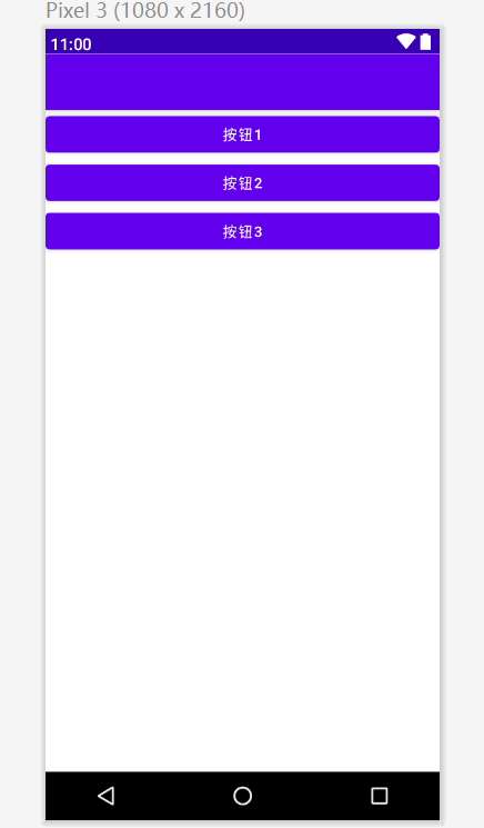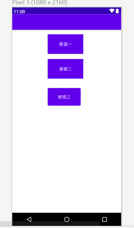 <?xml version="1.0" encoding="utf-8"?> <androidx.constraintlayout.widget.ConstraintLayout xmlns:android="http://schemas.android.com/apk/res/android" xmlns:tools="http://schemas.android.com/tools" android:layout_width="match_parent" android:layout_height="match_parent"> <Button android:id="@+id/btn_1" android:layout_width="128dp" android:layout_height="70dp" android:background="#FF0000" android:text="按钮一" tools:ignore="MissingConstraints" tools:layout_editor_absoluteX="128dp" tools:layout_editor_absoluteY="16dp" /> <Button android:id="@+id/btn_2" android:layout_width="128dp" android:layout_height="70dp" android:background="#FFFF37" android:text="按钮二" tools:ignore="MissingConstraints" tools:layout_editor_absoluteX="128dp" tools:layout_editor_absoluteY="105dp" /> <Button android:id="@+id/btn_3" android:layout_width="119dp" android:layout_height="75dp" android:text="按钮三" tools:ignore="MissingConstraints" tools:layout_editor_absoluteX="128dp" tools:layout_editor_absoluteY="203dp" /> </androidx.constraintlayout.widget.ConstraintLayout>