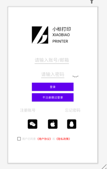 <?xml version="1.0" encoding="utf-8"?> <androidx.constraintlayout.widget.ConstraintLayout xmlns:android="http://schemas.android.com/apk/res/android" xmlns:tools="http://schemas.android.com/tools" android:layout_width="match_parent" android:layout_height="match_parent"> <ImageView android:id="@+id/v_1" android:layout_width="88dp" android:layout_height="94dp" android:background="@drawable/tubiao" tools:ignore="MissingConstraints" tools:layout_editor_absoluteX="121dp" tools:layout_editor_absoluteY="96dp" /> <TextView android:layout_width="wrap_content" android:layout_height="wrap_content" android:text="小标打印" android:textColor="#000000" android:textSize="24dp" tools:ignore="MissingConstraints" tools:layout_editor_absoluteX="229dp" tools:layout_editor_absoluteY="96dp" /> <TextView android:layout_width="wrap_content" android:layout_height="wrap_content" android:text="XIAOBIAO" android:textColor="#000000" android:textSize="20dp" tools:ignore="MissingConstraints" tools:layout_editor_absoluteX="229dp" tools:layout_editor_absoluteY="128dp" /> <TextView android:layout_width="wrap_content" android:layout_height="wrap_content" android:text="PRINTER" android:textColor="#000000" android:textSize="20dp" tools:ignore="MissingConstraints" tools:layout_editor_absoluteX="229dp" tools:layout_editor_absoluteY="162dp" /> <TextView android:layout_width="wrap_content" android:layout_height="wrap_content" android:text="注册账号" android:textColor="#d0d0d0" android:textSize="20dp" tools:ignore="MissingConstraints" tools:layout_editor_absoluteX="61dp" tools:layout_editor_absoluteY="520dp" /> <TextView android:layout_width="wrap_content" android:layout_height="wrap_content" android:text="忘记密码" android:textColor="#d0d0d0" android:textSize="20dp" tools:ignore="MissingConstraints" tools:layout_editor_absoluteX="294dp" tools:layout_editor_absoluteY="520dp" /> <EditText android:layout_width="wrap_content" android:layout_height="wrap_content" android:text="请输入账号/邮箱" android:textColor="#d0d0d0" android:textSize="24dp" tools:ignore="MissingConstraints" tools:layout_editor_absoluteX="133dp" tools:layout_editor_absoluteY="247dp" /> <EditText android:layout_width="wrap_content" android:layout_height="wrap_content" android:text="请输入密码" android:textColor="#d0d0d0" android:textSize="24dp" tools:ignore="MissingConstraints" tools:layout_editor_absoluteX="167dp" tools:layout_editor_absoluteY="321dp" /> <ImageView android:id="@+id/v_2" android:layout_width="42dp" android:layout_height="28dp" android:background="@drawable/tp" tools:ignore="MissingConstraints" tools:layout_editor_absoluteX="328dp" tools:layout_editor_absoluteY="346dp" /> <ImageView android:id="@+id/v_3" android:layout_width="56dp" android:layout_height="54dp" android:background="@drawable/wx" tools:ignore="MissingConstraints" tools:layout_editor_absoluteX="98dp" tools:layout_editor_absoluteY="579dp" /> <ImageView android:id="@+id/v_4" android:layout_width="56dp" android:layout_height="54dp" android:background="@drawable/ap" tools:ignore="MissingConstraints" tools:layout_editor_absoluteX="203dp" tools:layout_editor_absoluteY="579dp" /> <ImageView android:id="@+id/v_5" android:layout_width="56dp" android:layout_height="54dp" android:background="@drawable/qq" tools:ignore="MissingConstraints" tools:layout_editor_absoluteX="301dp" tools:layout_editor_absoluteY="579dp" /> <CheckBox android:layout_width="wrap_content" android:layout_height="wrap_content" android:text="用户已同意" android:textColor="#d0d0d0" tools:ignore="MissingConstraints" tools:layout_editor_absoluteX="40dp" tools:layout_editor_absoluteY="658dp" /> <TextView android:layout_width="wrap_content" android:layout_height="wrap_content" android:text="《用户协议》" android:textColor=" #FF0000" tools:ignore="MissingConstraints" tools:layout_editor_absoluteX="144dp" tools:layout_editor_absoluteY="673dp" /> <TextView android:layout_width="wrap_content" android:layout_height="wrap_content" android:text="《隐私政策》" android:textColor=" #FF0000" tools:ignore="MissingConstraints" tools:layout_editor_absoluteX="243dp" tools:layout_editor_absoluteY="673dp" /> <TextView android:layout_width="wrap_content" android:layout_height="wrap_content" android:text="和" android:textColor="#d0d0d0" tools:ignore="MissingConstraints" tools:layout_editor_absoluteX="229dp" tools:layout_editor_absoluteY="673dp" /> <Button android:layout_width="216dp" android:layout_height="43dp" android:background="#000000" android:backgroundTint="#ADADAD" android:text="登录" android:textColor="#ffffff" tools:ignore="MissingConstraints" tools:layout_editor_absoluteX="123dp" tools:layout_editor_absoluteY="391dp" /> <Button android:layout_width="216dp" android:layout_height="43dp" android:background="#000000" android:text="不注册跳过登录" android:textColor="#ffffff" tools:ignore="MissingConstraints" tools:layout_editor_absoluteX="123dp" tools:layout_editor_absoluteY="446dp" /> </androidx.constraintlayout.widget.ConstraintLayout>