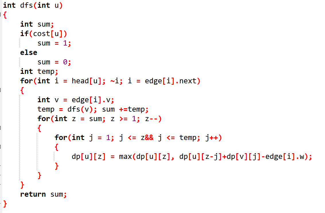 上面的temp是u这个节点的下面的最大子树返回的 那个***的东西的数量(就是 j 那个位置代表的东西), 然后 sum 这个值是以 u 这个节点为根节点的子树返回的的那个***的值。然后基本的思路就是和分组背包一样,把每个子树看成一组,然后通过子树的组来更新大的组。
