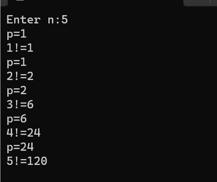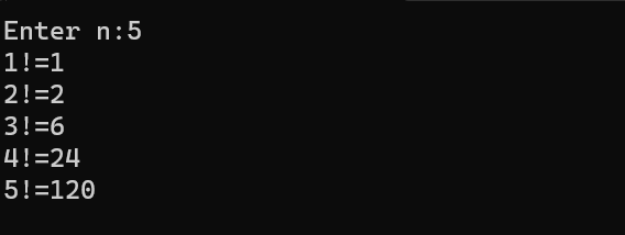 printf("%d!=%lld\n",i,fac(i));