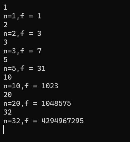 printf("n=%d,f = %lld\n",n,f-1);