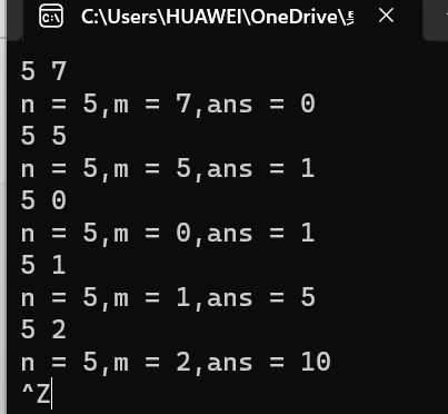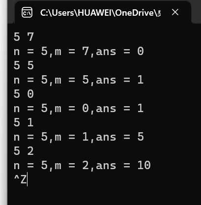 printf("n = %d,m = %d,ans = %d\n",n,m,func(n,m));