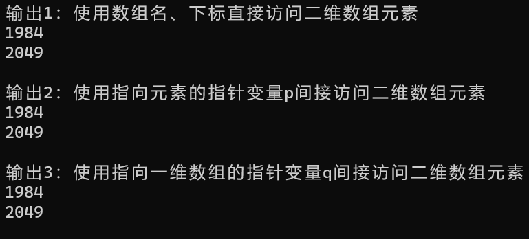 printf("\n输出2:使用指向元素的指针变量p间接访问二维数组元素\n");