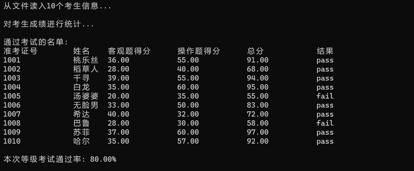 printf("\n本次等级考试通过率: %.2f%%\n", pass_rate*100);