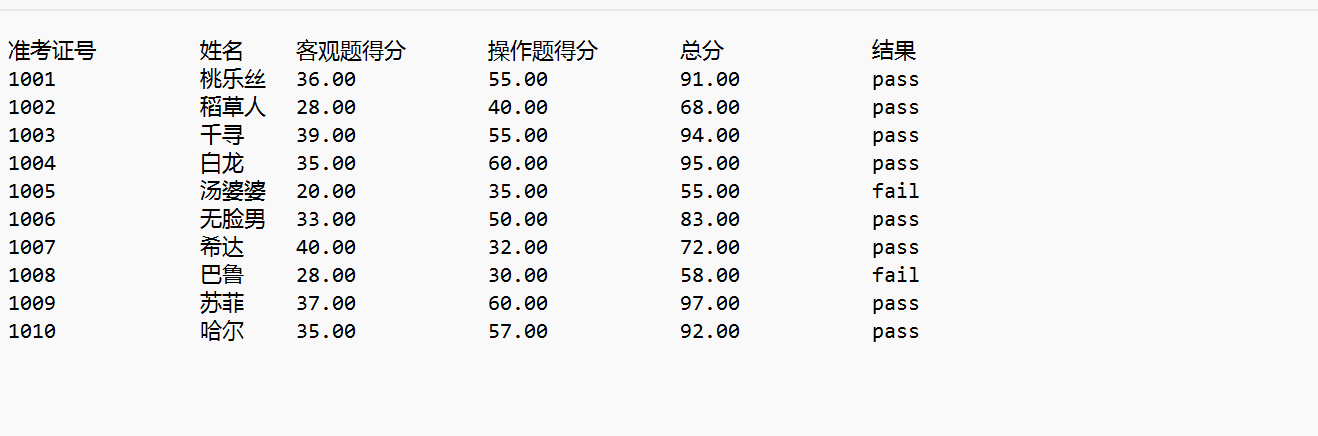 // 准考证号,姓名,客观题得分,操作题得分,总分,结果