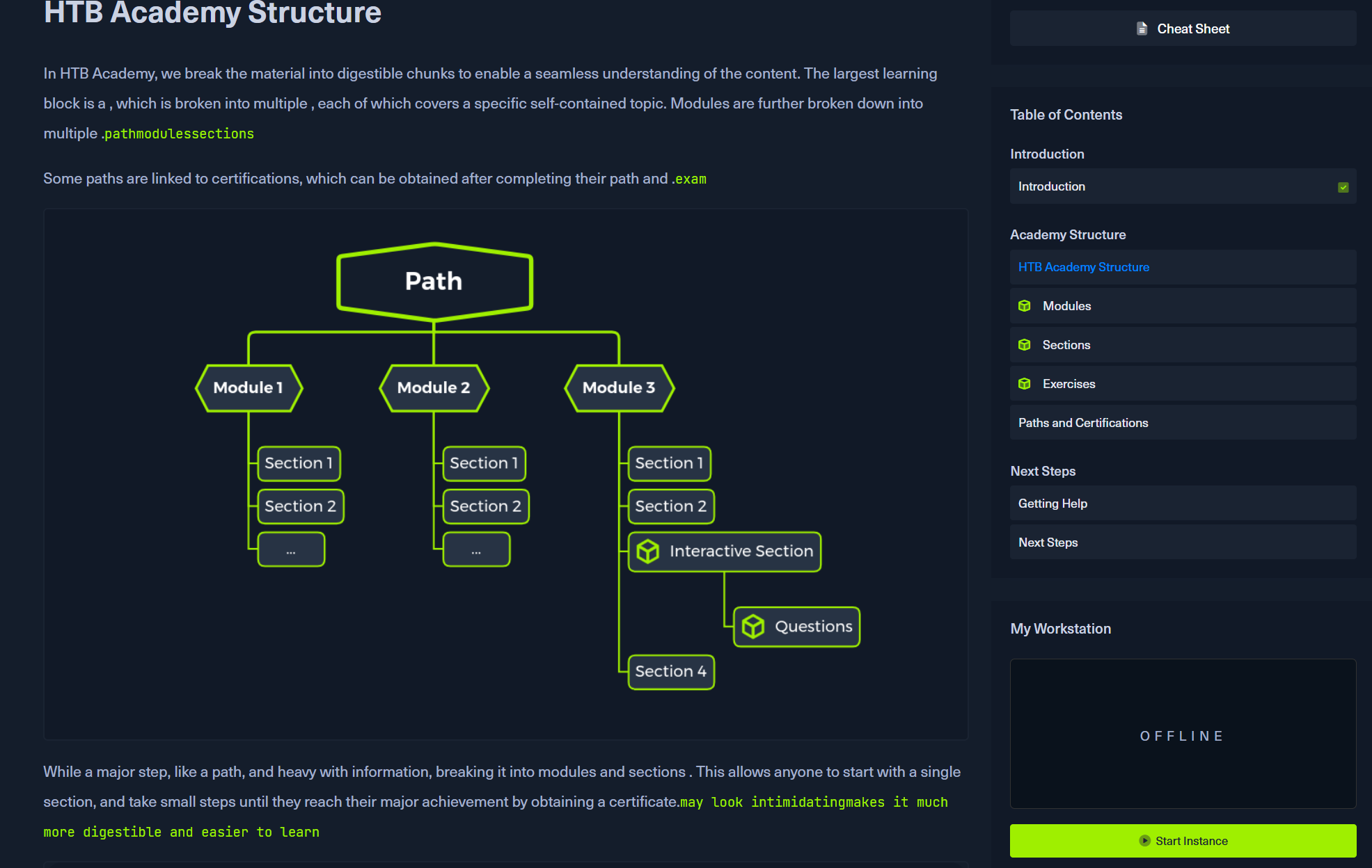 在 HTB Academy 中,我们将材料分解成易于理解的块,以便无缝理解内容。最大的学习块是 ,它分为多个 ,每个 块都涵盖一个特定的自包含主题。模块进一步细分为多个 。path``modules``sections