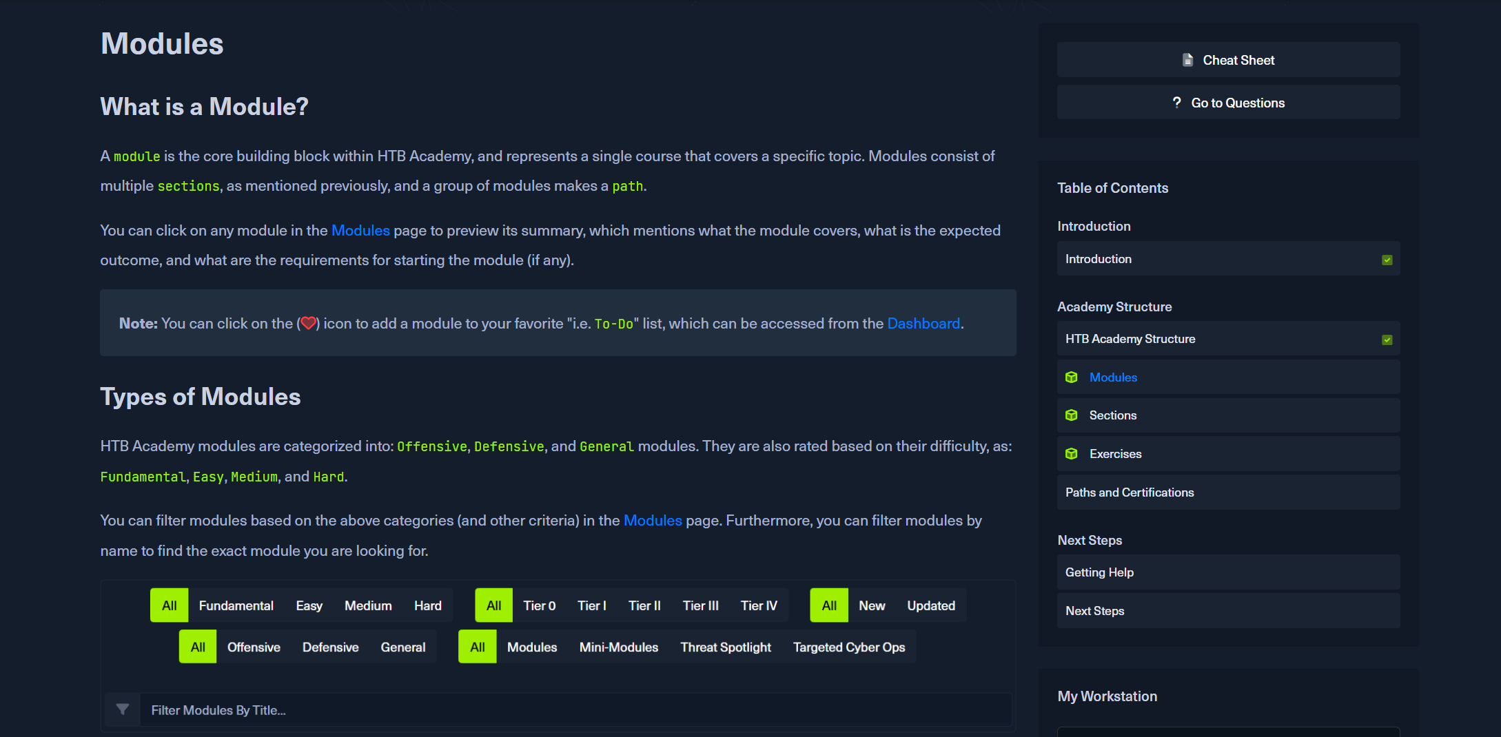 HTB Academy 模块分为:、 和 模块。它们还根据难度进行评级,如:、、 和 。Offensive``Defensive``General``Fundamental``Easy``Medium``Hard