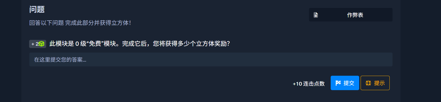 Tier 0`模块被视为 ,因为它们花费 10 个立方体并奖励 10 个立方体,因此不会影响您剩余的立方体余额。请记住,要拿回立方体,这样做是为了激励学生完成每个模块。`free modules``you must complete the module