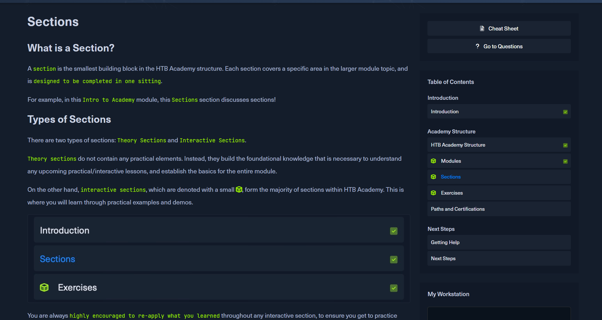 另一方面,用小 表示的 构成了 HTB Academy 中的大部分部分。在这里,您将通过实际示例和演示进行学习。interactive sections