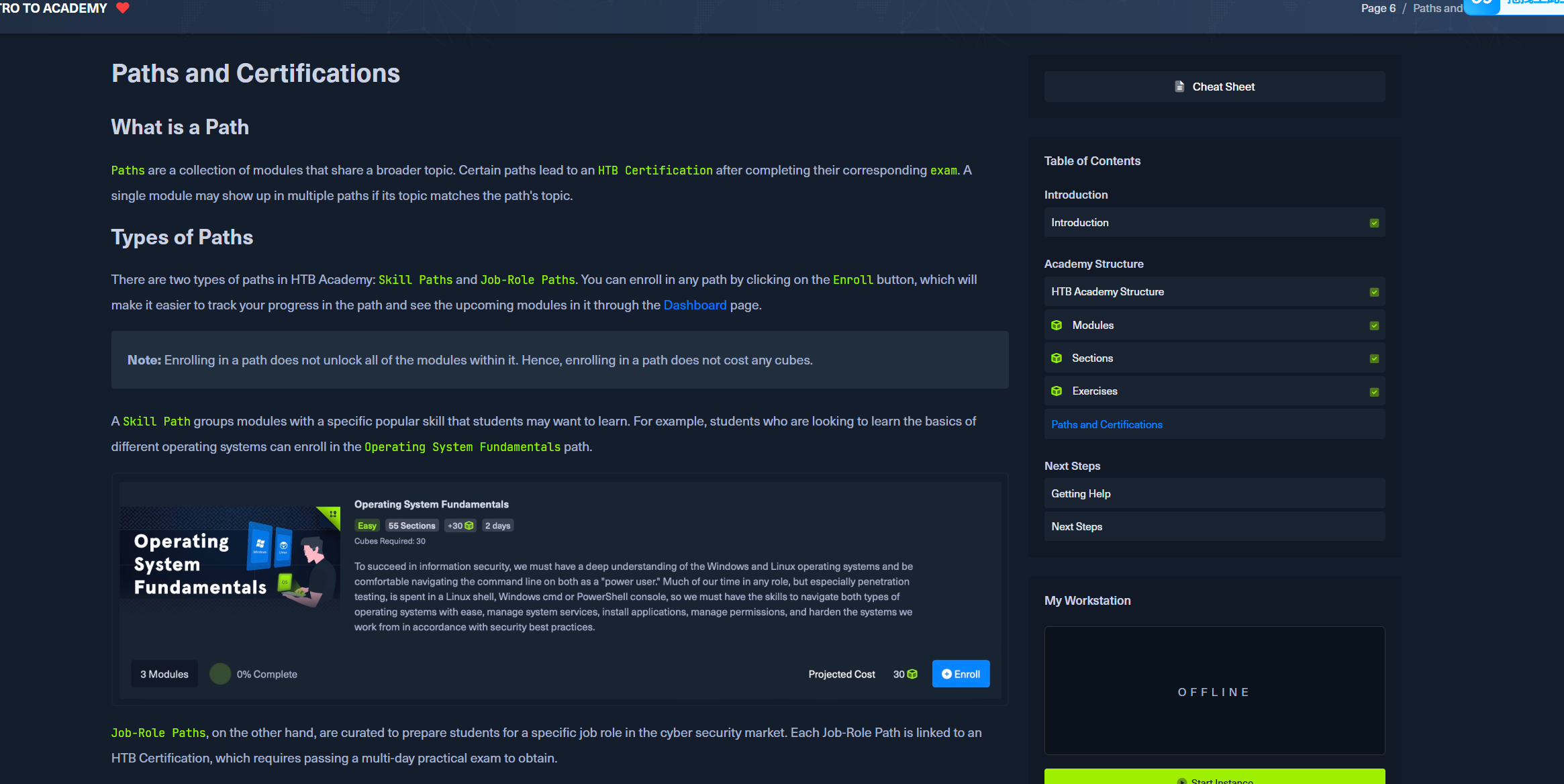 HTB Academy 中有两种类型的路径: 和 .您可以通过单击按钮注册任何路径,这将更容易跟踪您在路径中的进度,并通过 Dashboard 页面查看其中即将推出的模块。Skill Paths``Job-Role Paths``Enroll