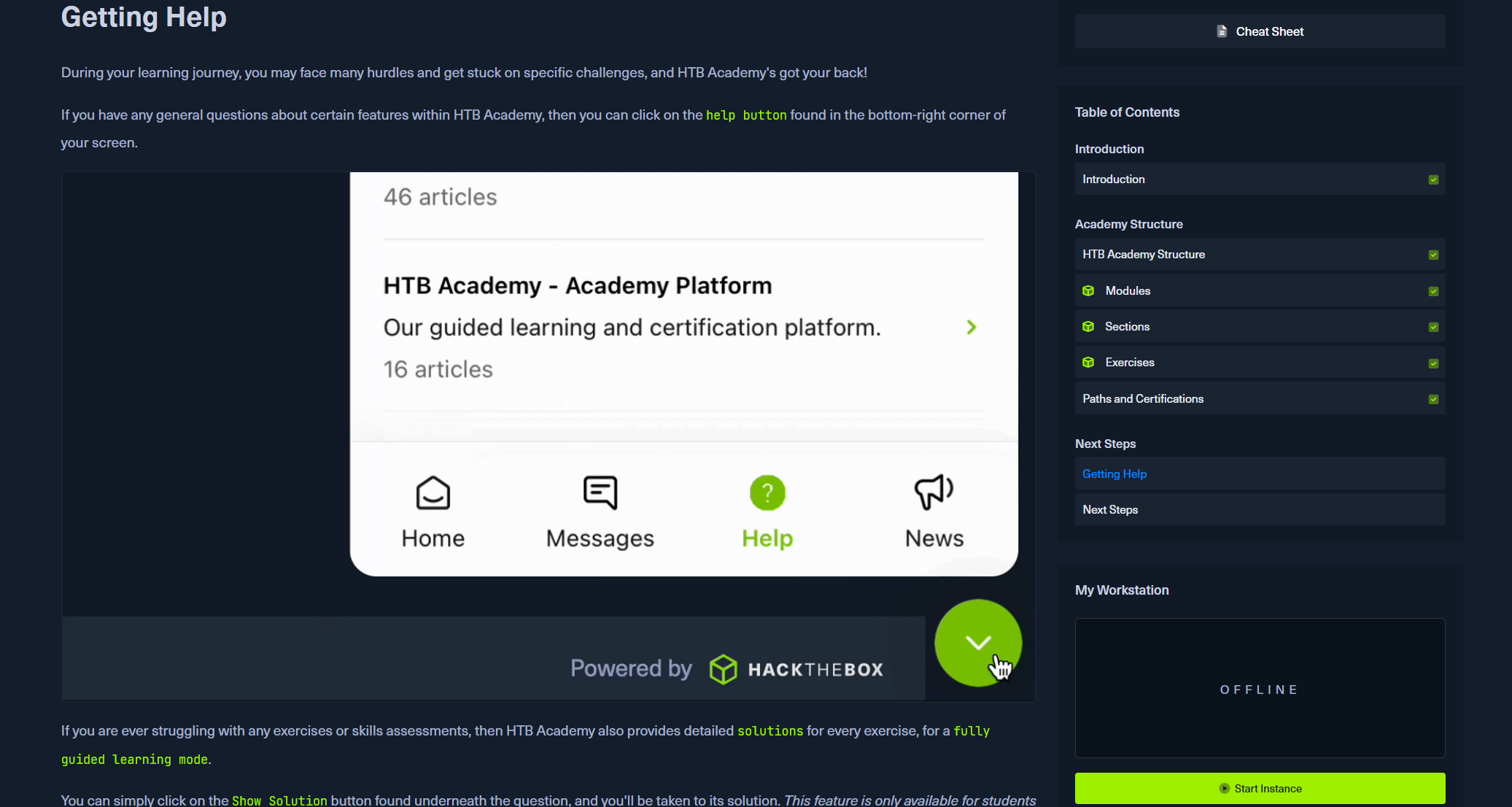如果您曾经为任何练习或技能评估而苦苦挣扎,那么 HTB 学院还为每项练习提供了详细的 .solutions``fully guided learning mode