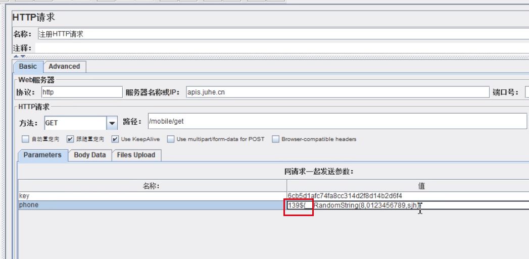 复制函数字符串的值,在请求的地方将手机号的值改为生成的函数字符串值