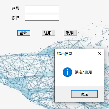 if (UserName == "") { MessageBox.Show("请输入账号","提示信息",MessageBoxButtons.OK,MessageBoxIcon.Asterisk); return; } else if (hr.HasRows) { MessageBox.Show("登录成功","提示信息",MessageBoxButtons.OK,MessageBoxIcon.Asterisk); Form2 form2 = new Form2(); form2.Show(); //隐藏窗体 this.Hide(); } else { MessageBox.Show("账号或密码错误", "提示信息", MessageBoxButtons.OKCancel, MessageBoxIcon.Question); }