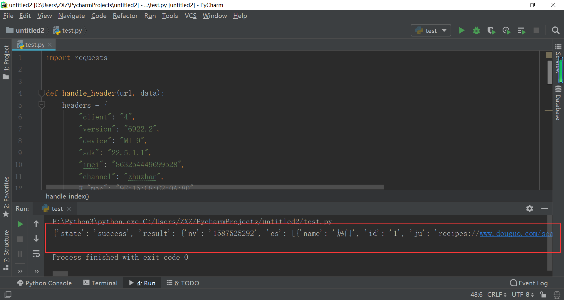 import requests def handle_header(url, data): headers = { "client": "4", "version": "6922.2", "device": "MI 9", "sdk": "22,5.1.1", "imei": "863254449699528", "channel": "zhuzhan", # "mac": "9E:15:C8:C2:0A:80", "resolution": "1600*900", "dpi": "2.0", # "android-id": "701ce79f5ff14457", # "pseudo-id": "79f5ff14457701ce", "brand": "Xiaomi", "scale": "2.0", "timezone": "28800", "language": "zh", "cns": "0", "carrier": "CHINA+MOBILE", # "imsi": "460074457995241", "user-agent": "Mozilla/5.0 (Linux; Android 5.1.1; MI 9 Build/NMF26X; wv) AppleWebKit/537.36 (KHTML, like Gecko) Version/4.0 Chrome/74.0.3729.136 Mobile Safari/537.36", "reach": "1", "newbie": "1", "Content-Type": "application/x-www-form-urlencoded; charset=utf-8", # "Accept-Encoding": "gzip, deflate", "Connection": "Keep-Alive", # "Cookie": "duid=64130799", "Host": "api.douguo.net", # "Content-Length": "68", } response = requests.post(url=url, headers=headers, data=data) return response def handle_index(): url = 'http://api.douguo.net/recipe/flatcatalogs' data = { "client": "4", # "_session": "1587519801994863254449699528", # "v": "1503650468", "_vs": "2305", } response = handle_header(url, data) print(response.json()) if __name__ == '__main__': handle_index()