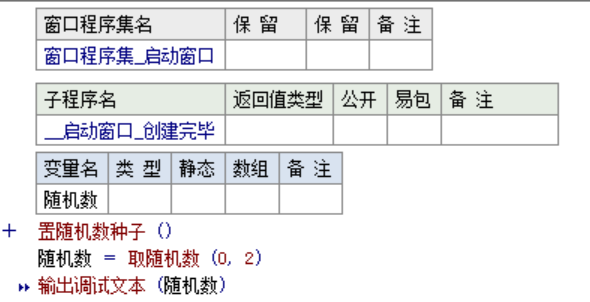 .版本 2 .程序集 窗口程序集_启动窗口 .子程序 __启动窗口_创建完毕 .局部变量 随机数 置随机数种子 () 随机数 = 取随机数 (0, 2) 输出调试文本 (随机数)