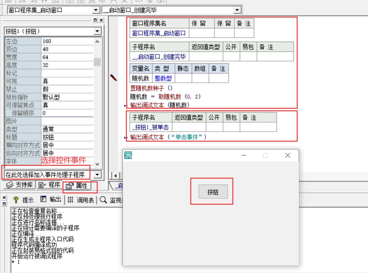 .版本 2 .程序集 窗口程序集_启动窗口 .子程序 __启动窗口_创建完毕 .局部变量 随机数, 整数型 置随机数种子 () 随机数 = 取随机数 (0, 2) 输出调试文本 (随机数) .子程序 _按钮1_被单击 输出调试文本 (“单击事件”)