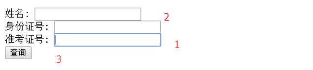 <form> <label>姓名: <input type="text" name="name" tabindex="2"/></label> <br/> <label>身份证号: <input type="text" name="city" tabindex="-1"/></label> </br> <label>准考证号: <input type="text" name="country" tabindex="1"/></label> </br> <input type="submit" value="查询" tabindex="3"/> </form>