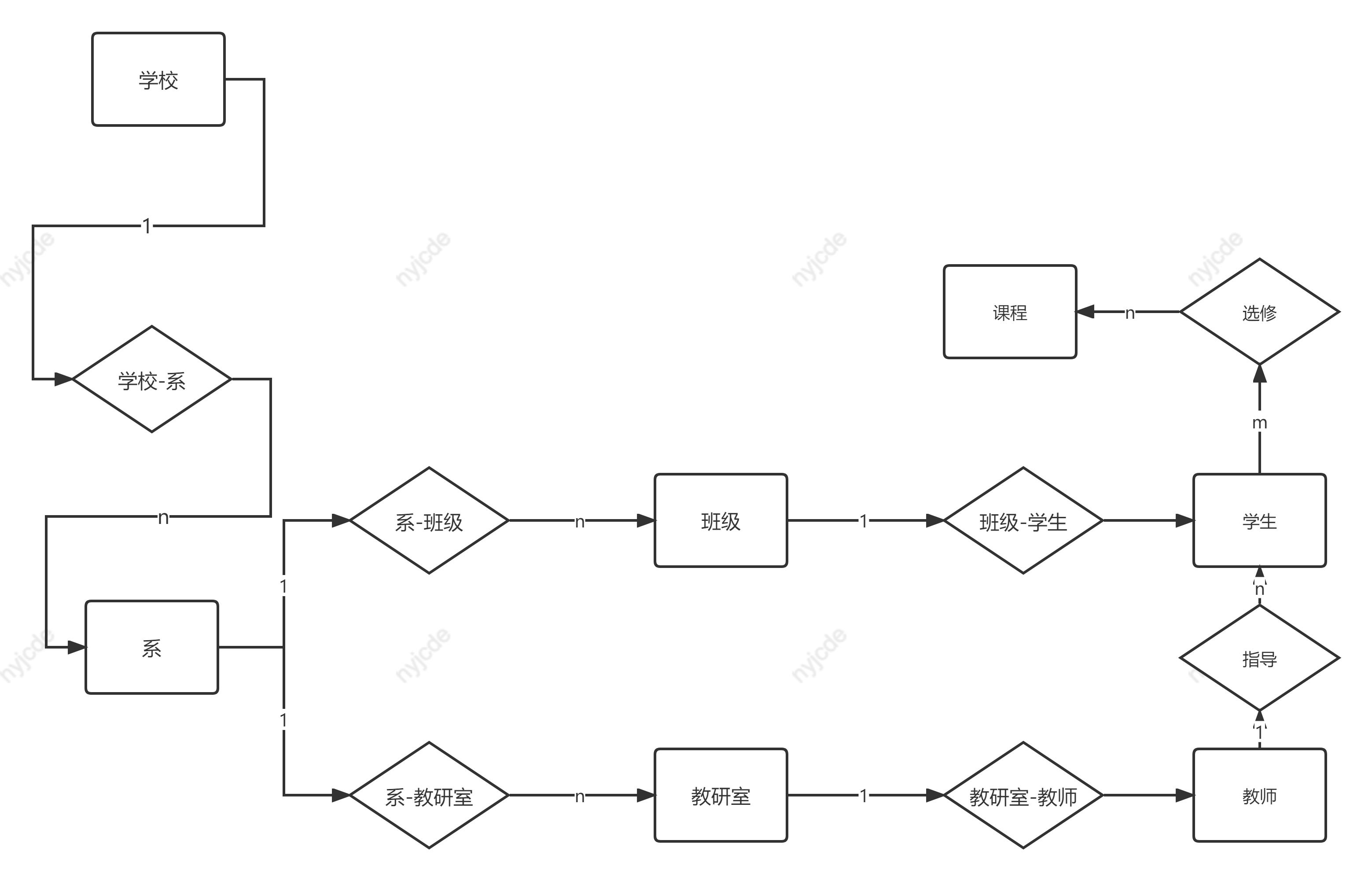 学校中有若干系,每个系有若干班级和教研室,每个教研室有若干教员,其中有的教授和副教授 每人各带若干研究生,每个班有若干学生,每个学生选修若干课程,每门课可由若干学生选修。请用E-R 图画出此学校的概念模型。