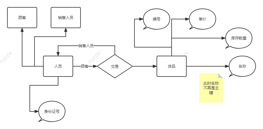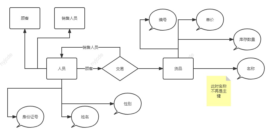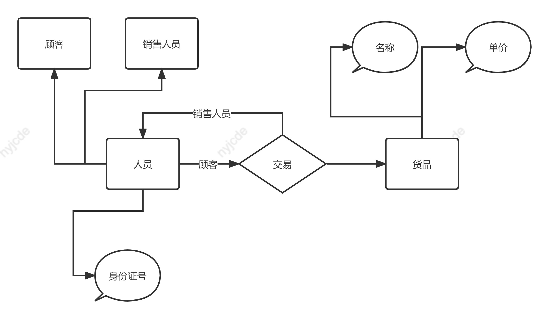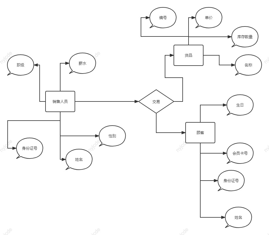 现开发⼀套销售管理系统,需保存交易记录信息,包括销售⼈员身份证号、顾客身份证号、售卖货品名 称、数量、单价。请绘制数据库建模的ER图。