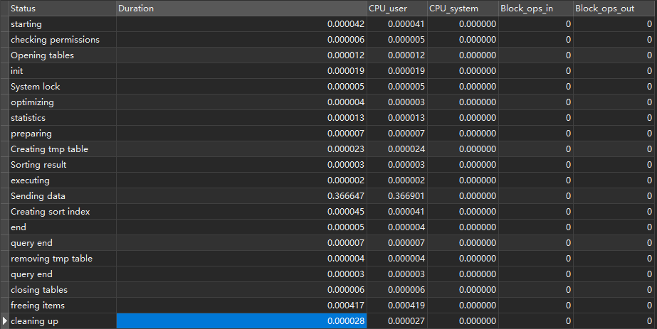SHOW PROFILE cpu,block io for query 39;(39 上面问题SQL的queryID)