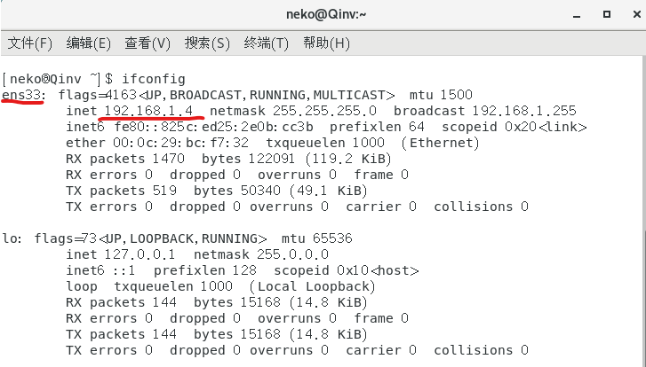 在"ens33"行,找到inet后面就是linux的ip地址。