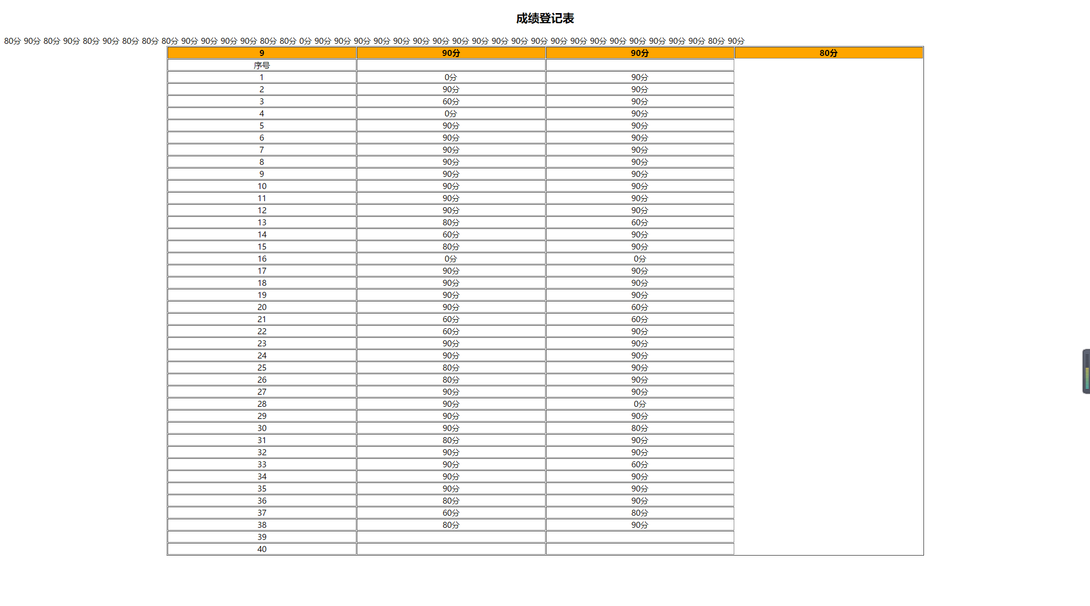seg1=''' <!DOCTYPE HTML>\n<html>\n<body>\n<meta charset=gb> <h2 align=center>成绩登记表</h2> <table border='1' align="center" width=70%> <tr bgcolor='orange'>\n''' seg2="</tr>\n" seg3="</table>\n<body>\n</html>" def fill_data(locls): seg='<st><td align="center">{}</td><td align="center">\ {}</td><td align="center">{}</td><tdalign="center">\ {}</td></tr>\n'.format(*locls) return seg fr=open("D:\Python作业/成绩登记表.csv","r") ls=[] for line in fr: line=line.replace("\n","") ls.append(line.split(",")) fr.close() fw=open("D:\Python作业/成绩登记表.csv.html","w") fw.write(seg1) fw.write('''<th width="25%">{}</th>\n<th width="25%">{}</th>\n<th width="25%">{}</th>\n<th width="25%">{}</th>\n'''.format(*ls[10])) fw.write(seg2) for i in range(len(ls)-1): fw.write(fill_data(ls[i+1])) fw.write(seg3) fw.close()