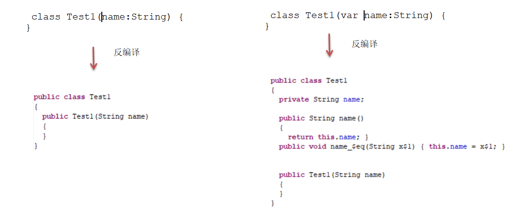 如果参数使用var关键字声明,那么那么Scala会将参数作为类的成员属性使用,并会提供属性对应的xxx()[类似getter]/xxx_$eq()[类似setter]方法,即这时的成员属性是私有的,但是可读写。